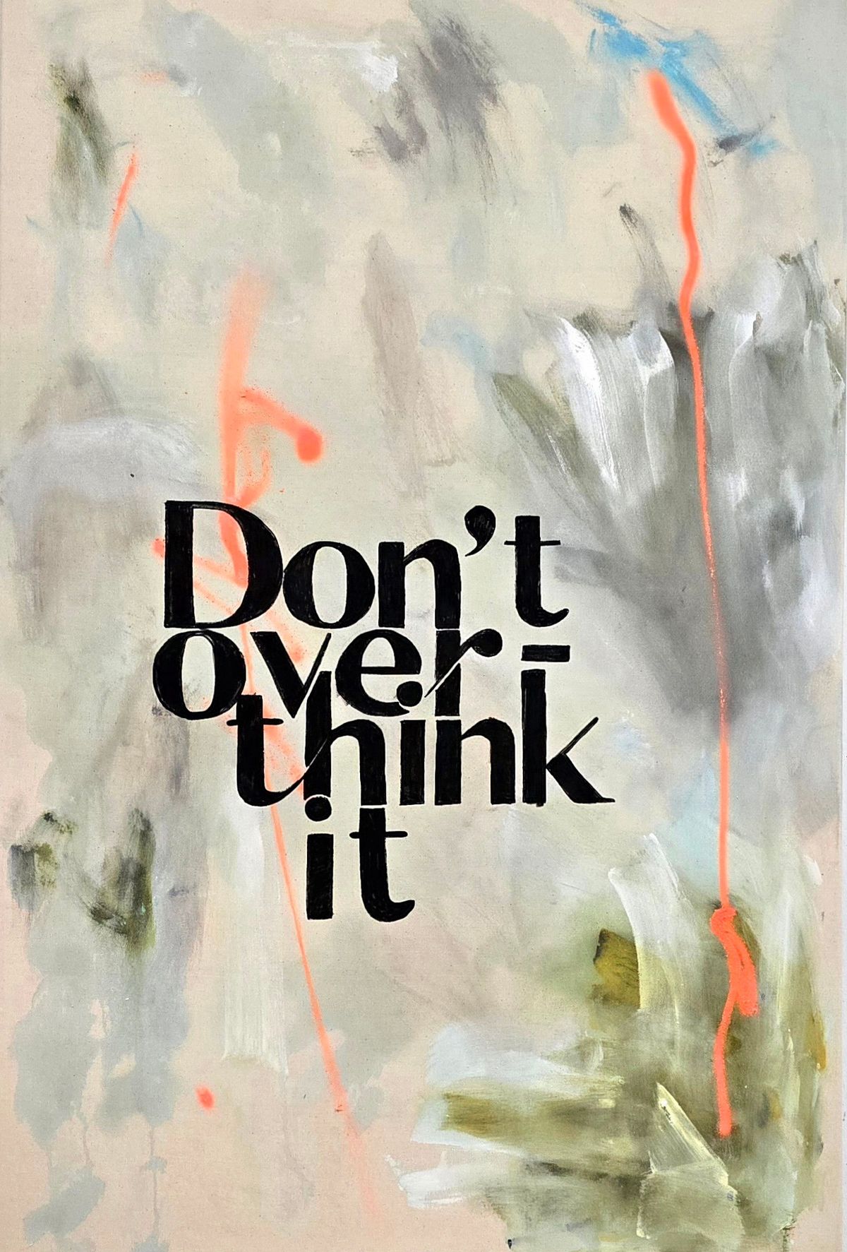“Don’t overthink it” – the world’s friendliest passive-aggressive advice. The phrase sits there, bold and confident, while the background quietly loses its mind. Soft clouds of grey and beige try to stay calm, but those neon streaks betray the truth — this canvas is having an existential panic attack and pretending it’s fine. The words command serenity, but the painting twitches. It hums. It buzzes. It’s the visual equivalent of telling yourself to relax while your brain is on fire. The background feels like the inside of a skull that’s been thinking too hard for too long — fog, noise, flashes of orange like intrusive thoughts. And in the middle: the mantra. The lie. Don’t overthink it. It’s both therapy and mockery. A digital-age prayer for people who meditate with clenched jaws and scrolling thumbs. A calm voice, whispering through chaos, knowing damn well you’ll overthink this too.
